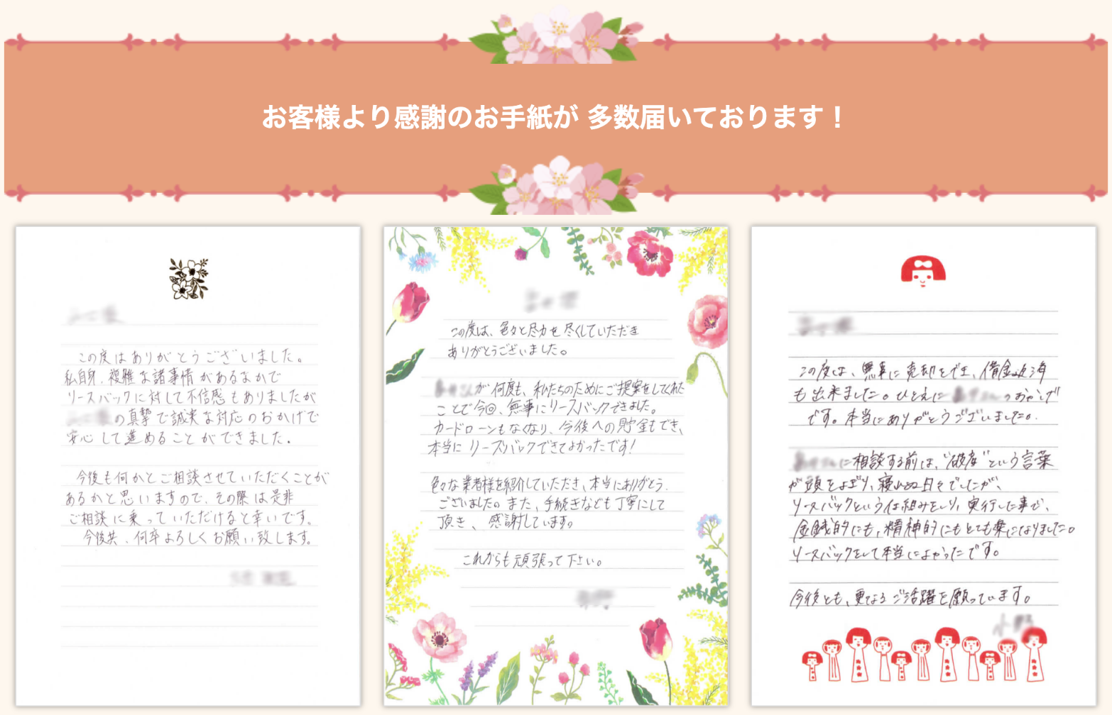 数社からは買取価格が残債をこえないという回答も頂いていた中で最終的にリースバックをすることができ大変助かりました。 -